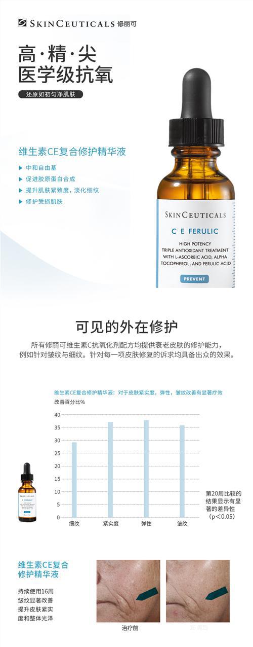 含15%左旋维C,抵御自由基侵害,提供持久抗氧化保护,预防光老化,同时高浓维C有助促进胶原合成,淡化细纹、皱纹等岁月痕迹